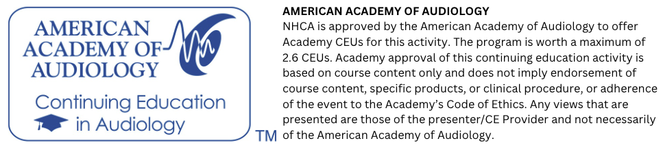 The National Hearing Conservation Association’s 49th Annual Conference, February 5 – 7, 2026, is approved for CEUs from the organizations listed below.